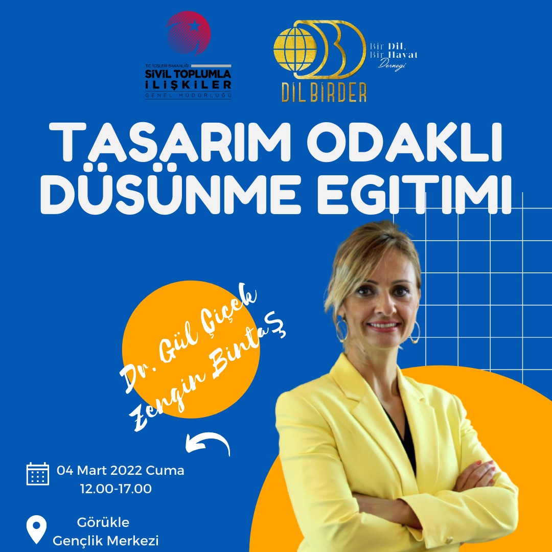 Sayın DR. Gül çiçek hanımın eğitimini vereceği tasarım odaklı düşünce eğitimleri başladı 4 mart cuma günü 12-17 görükle gençlik merkezinde olacak olan eğitimlerimize davetlisiniz. Kayıt lünki